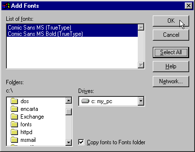 4 Find your fonts by using the Folders: and Drives: boxes at the bottom. If you don't know where you unzipped them, try looking in the "temp" folder which is inside the "windows" folder. Or use the Find feature in the Tools menu of Windows Explorer. In the List of fonts: box, click on the font that you want to install then click on OK. If you want more than one font, hold the Ctrl key while you click on the fonts or just click on the Select All button. |